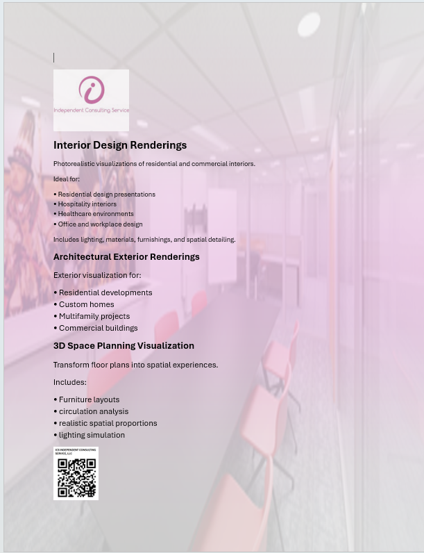 This Interior Design Consulting Company is full-service for commercial office planning, commercial design and corporate branding (Graphic Design). It serves local & state govt projects, non-for-profit organizations, and commercial real estate. The consulting company is a subcontractor with major system furniture vendors, office furniture companies , local architectural firms and construction companies in most commercial projects. Independent Consulting Service is registered small female minority business in Prince George's County.